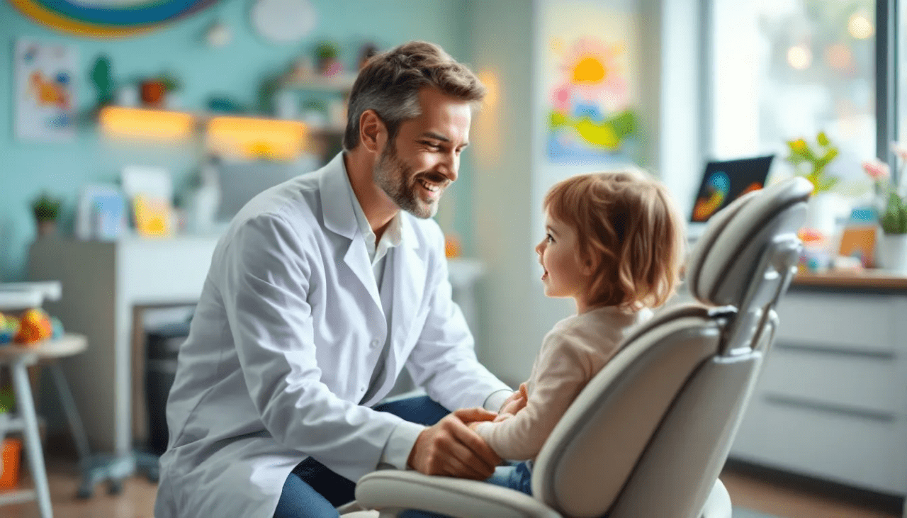 In the image, a caring pediatric dentist is shown interacting with a young patient in a colorful and inviting dental office, creating a supportive environment that promotes children's comfort during their dental visit. The dentist, who is board-certified, is focused on ensuring a positive experience for the child while emphasizing the importance of maintaining excellent oral health.